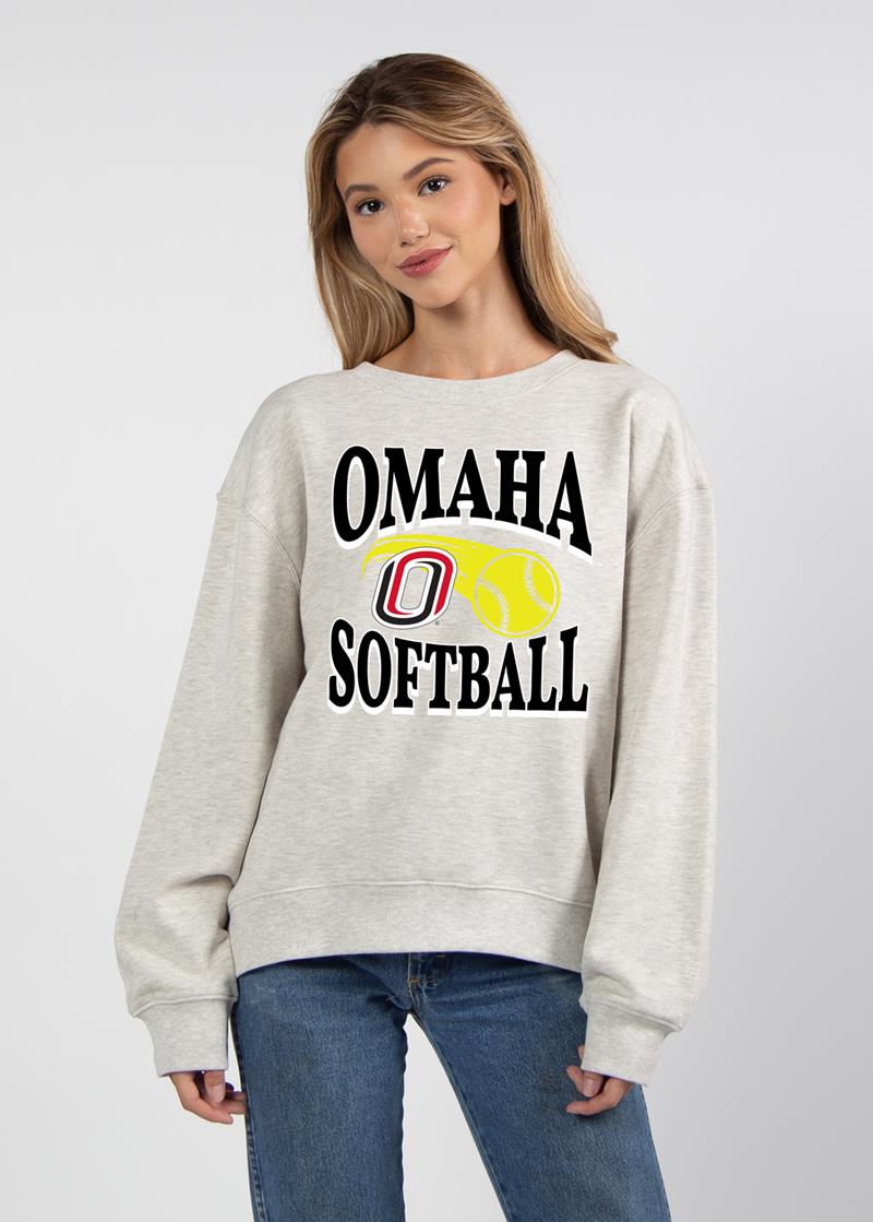 WOMEN'S ASH GRAY OMAHA O LOGO (FLYING SOFTBALL GRAPHIC) SOFTBALL CREW